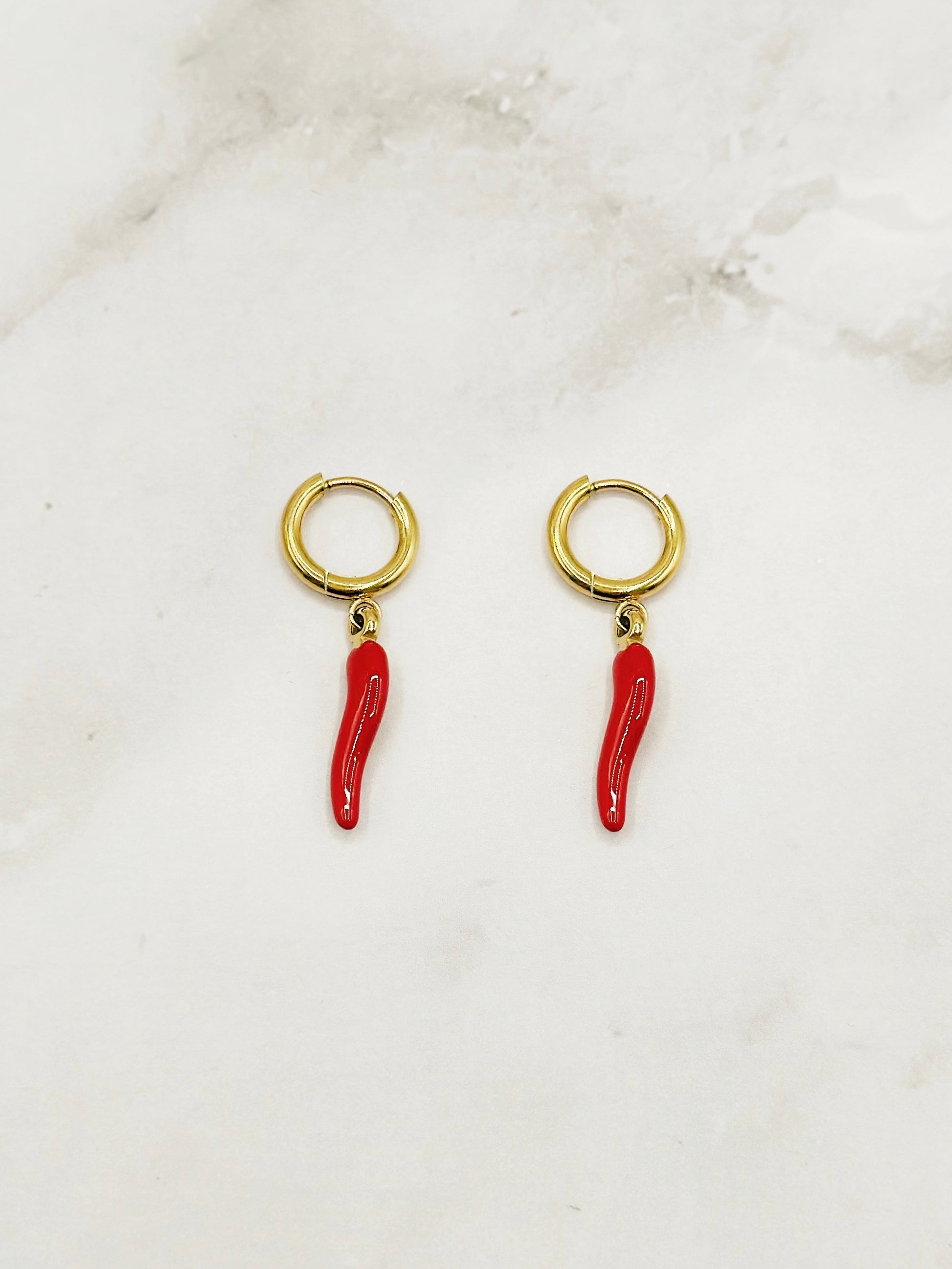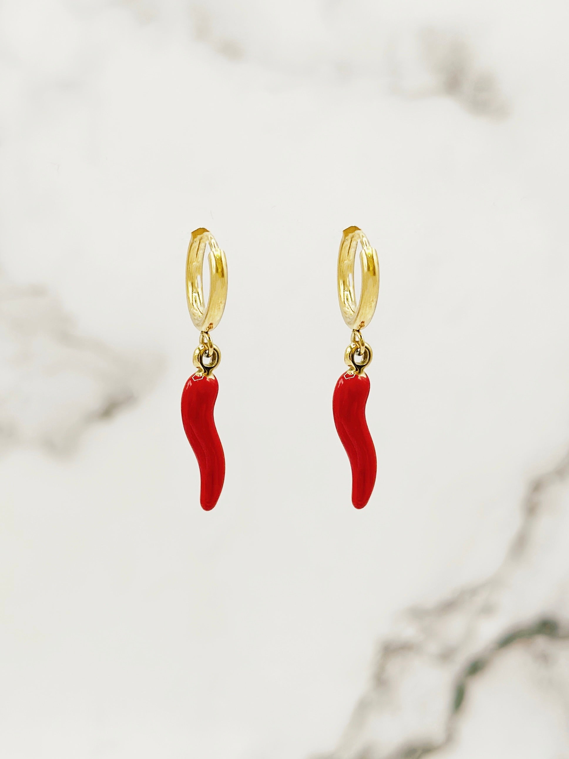 Ces créoles en acier inoxydable sont ornées d’un pendentif en forme de piment couleur rouge
