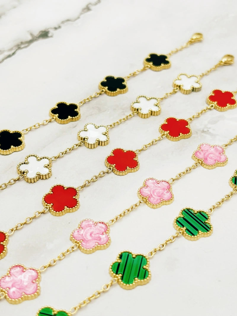 Chaque bracelet est composé d'une chaîne fine ornée de charms en forme de trèfles à cinq feuilles, symboles de rareté et de chance exceptionnelle. Les trèfles, finement bordés de petites perles dorées, sont disponibles dans une variété de couleurs vives : noir profond, blanc pur, rouge éclatant, rose tendre, et vert rayé. Ces couleurs contrastent joliment avec la finition dorée de la chaîne, ajoutant une touche de modernité à l'ensemble.