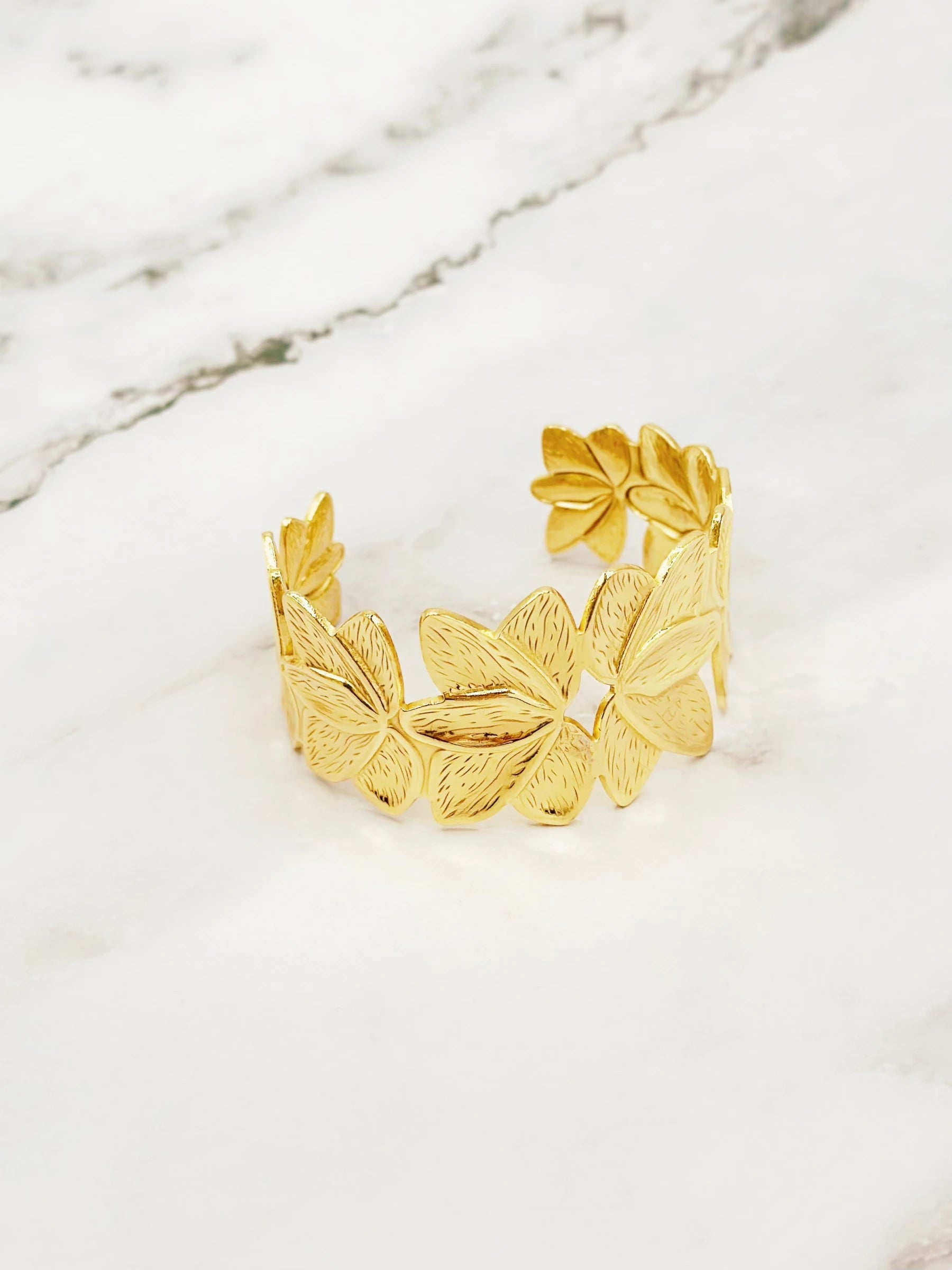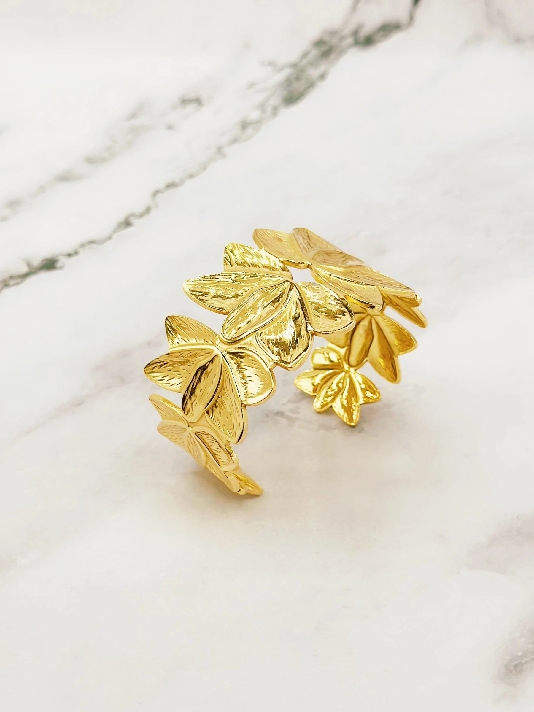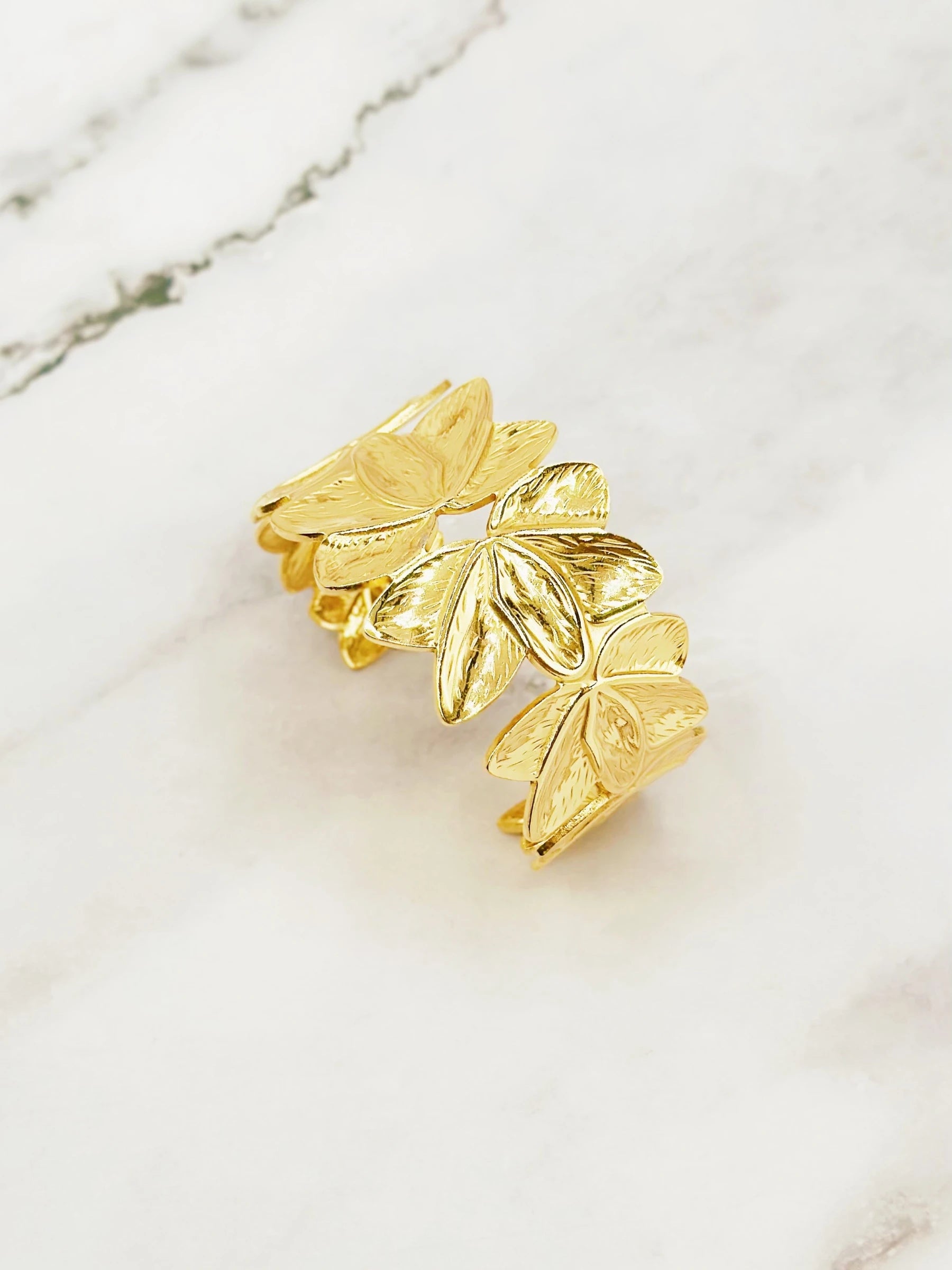 Ce jonc raffiné est orné de feuilles finement texturées, disposées en couronne. Son design ouvert permet un ajustement facile à tous les poignets. Léger et éclatant, il apporte une touche naturelle et élégante à toutes vos tenues.